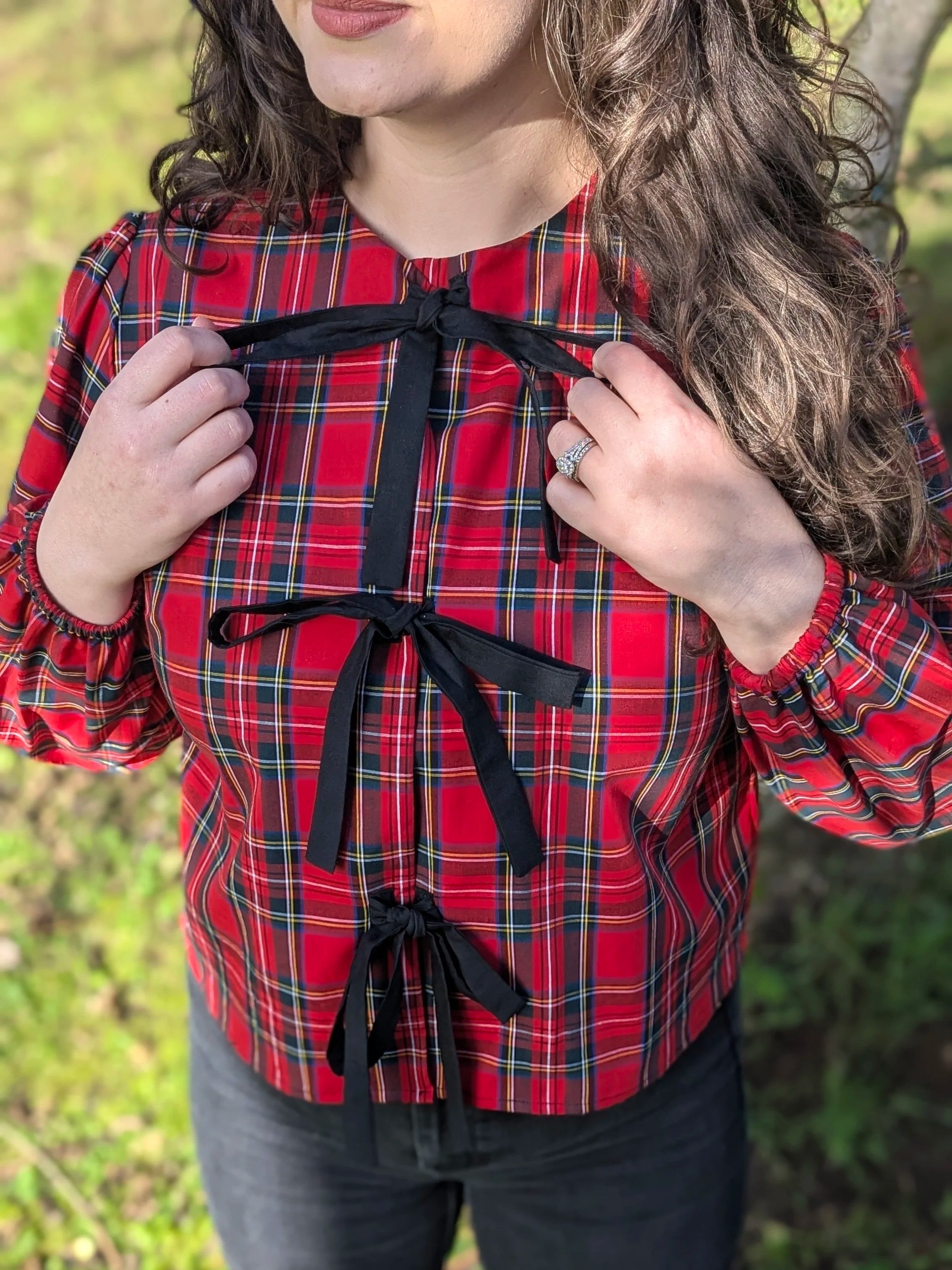 Cropped fit with puff sleeves, elasticated cuff, and three front ties.